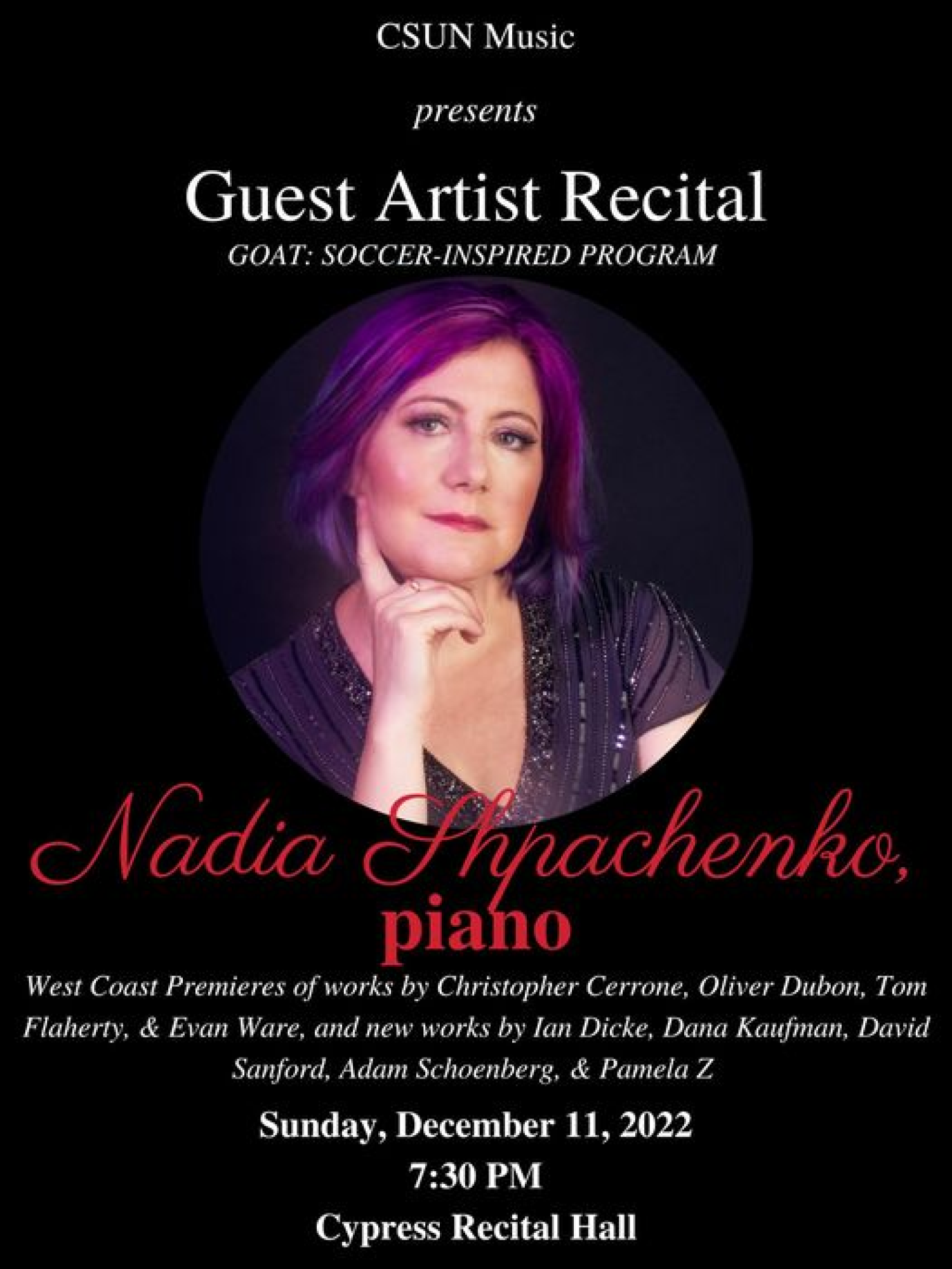 I will be performing my full GOAT soccer-inspired program at California State University, Northridge this Sunday, Dec. 11 at 7:30 pm (CSUN Cypress Recital Hall, 18111 Nordhoff Street, Northridge, CA 91330). Works by Christopher Cerrone, Pamela Z, David Sanford, Dana Kaufman, Adam Schoenberg, Ian Dicke, Tom Flaherty, Oliver Dubon, and Evan Ware, produced by Barry Werger.