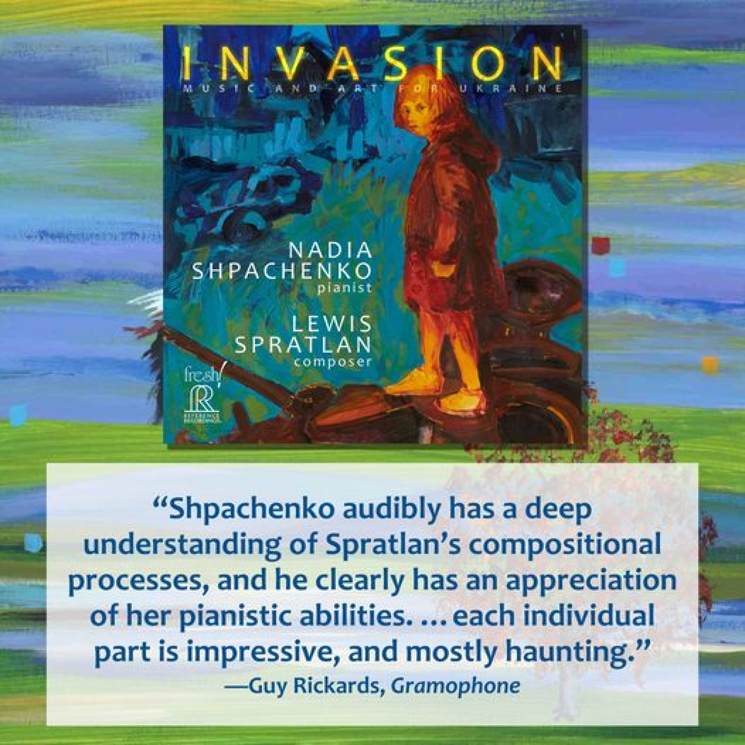 “Lewis Spratlan’s Invasion is a raucous, volatile tone poem… Invasion is the music of indignation and outrage, its combative nature (it does have a more contemplative central section) mirrored in the scoring, with broadsides of drums, brass fanfares, and the maniacal presence of the mandolin which, with the piano, seems to indicate a human presence amid the mechanistic carnage. The performance is powerful… Shpachenko audibly has a deep understanding of Spratlan’s compositional processes, and – in writing all bar Wonderer for her – he clearly has an appreciation of her pianistic abilities… each individual part is impressive, and mostly haunting.”