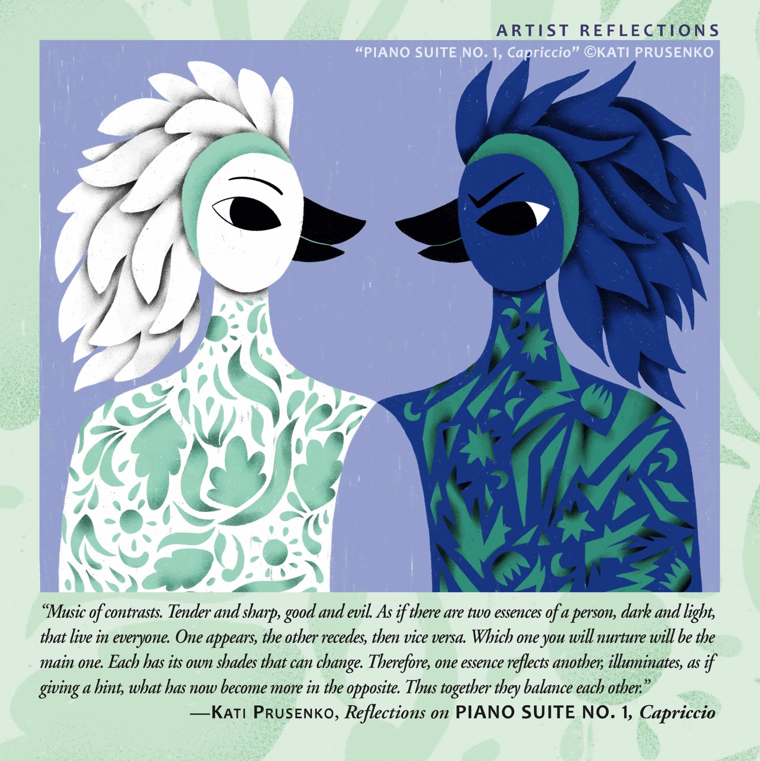 "Music of contrasts. Tender and sharp, good and evil. As if there are two essences of a person, dark and light, that live in everyone. One appears, the other recedes, then vice versa. Which one you will nurture will be the main one. Each has its own shades that can change. Therefore, one essence reflects another, illuminates, as if giving a hint, what has now become more in the opposite. Thus together they balance each other.”